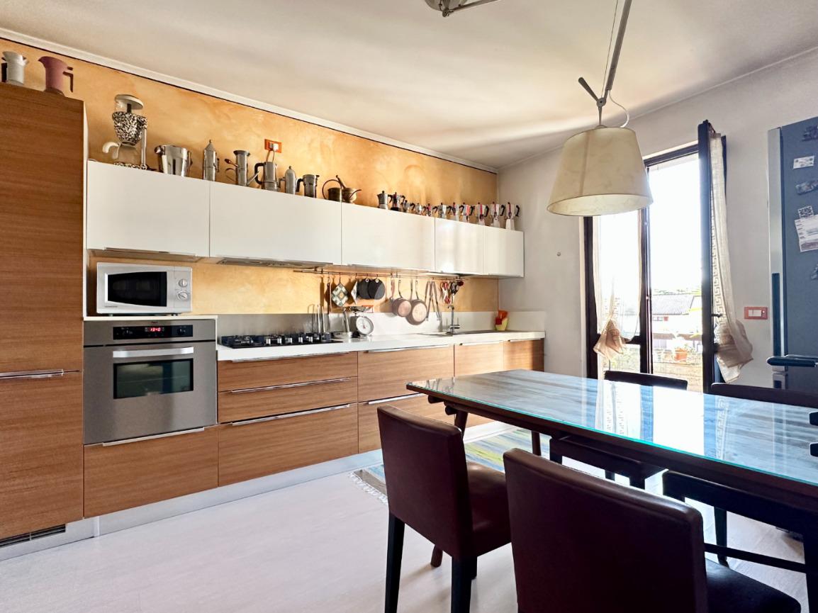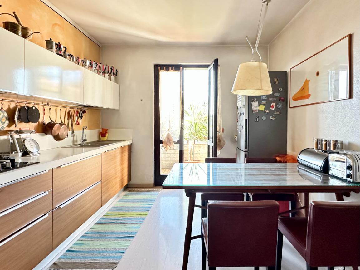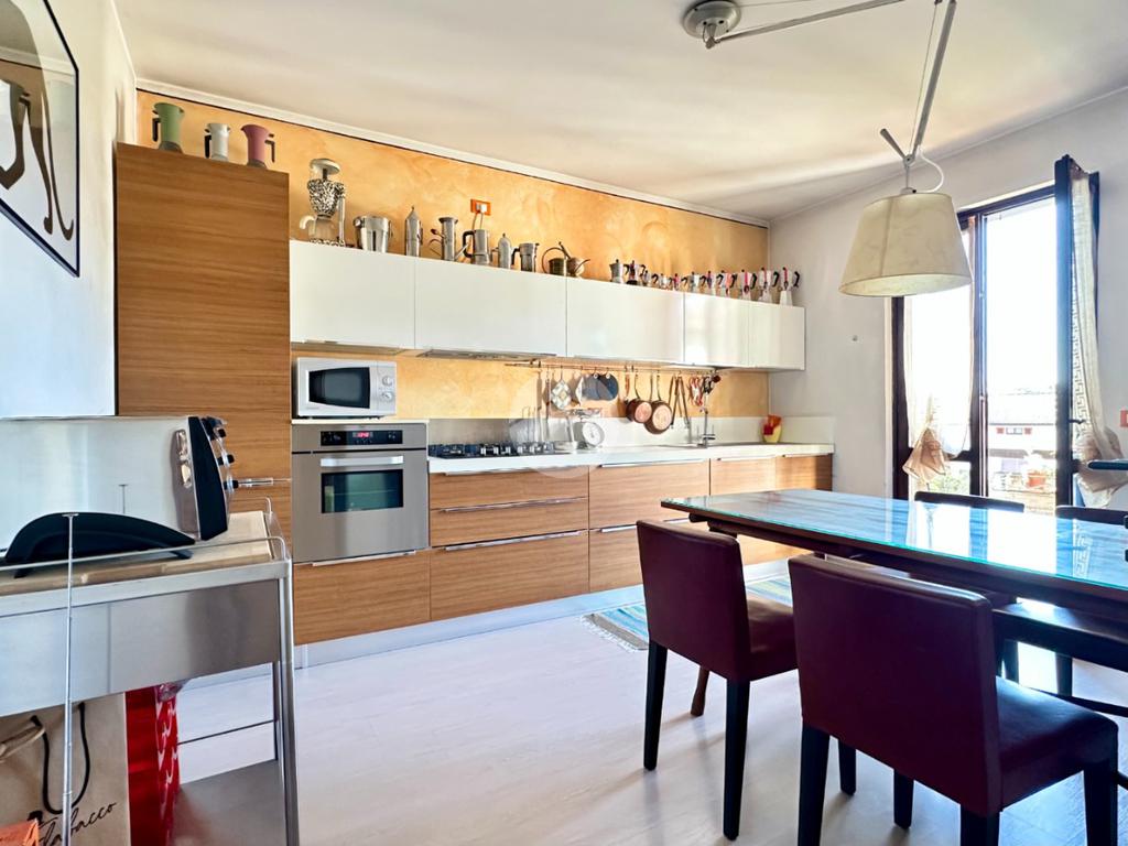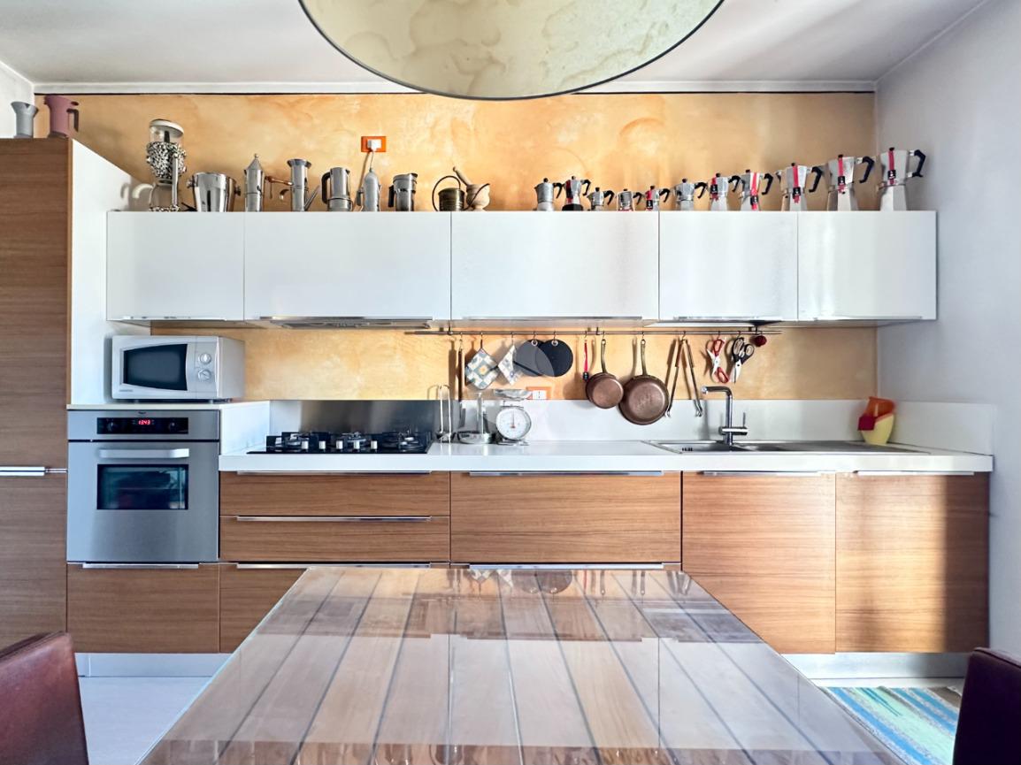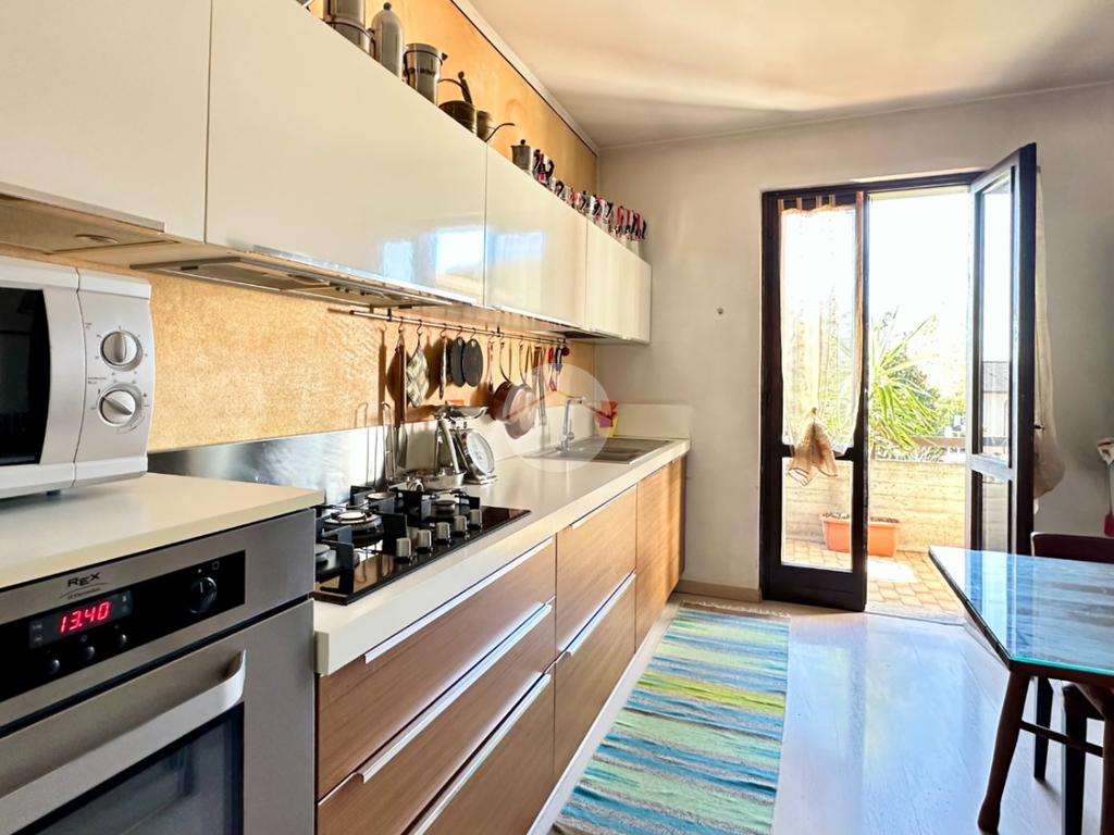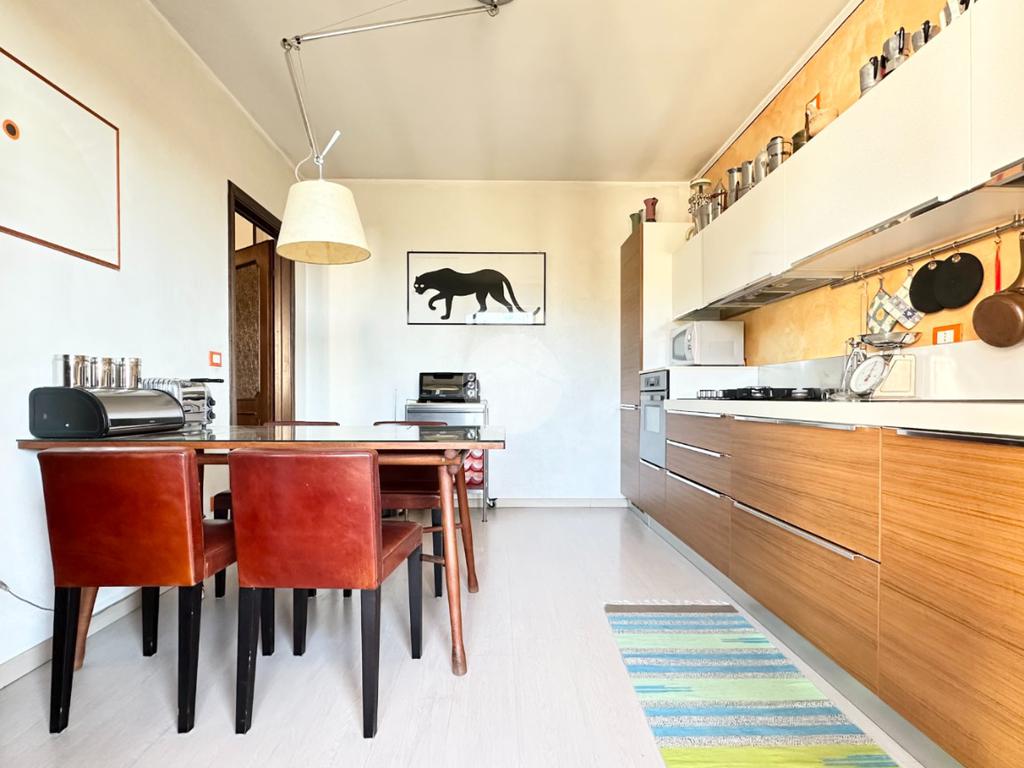 La cucina è separata ed ha accesso al balcone. La parete cottura è di generose dimensioni e lascia spazio per inserire un tavolo da pranzo.