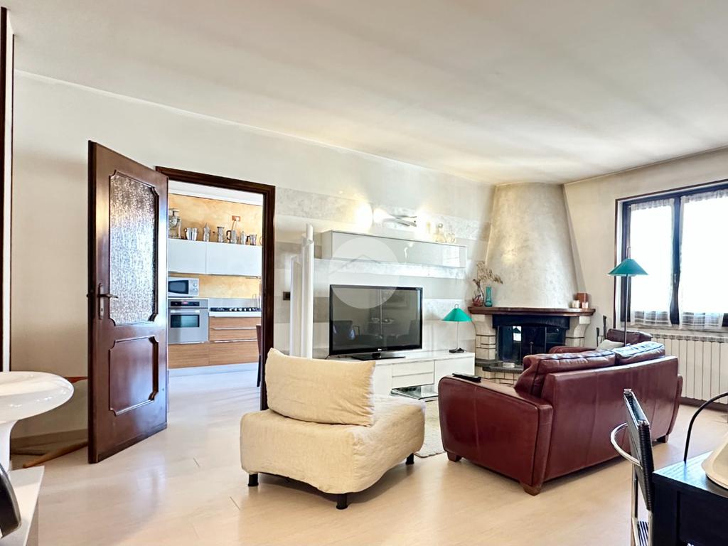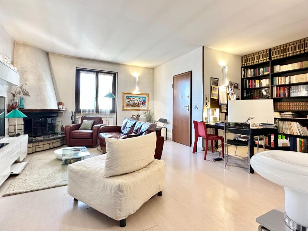 Dalla scala comune si raggiunge l'appartamento al piano primo. L'ingresso è diretto nel soggiorno. Il punto focale è il camino angolare, attorniato dal divano e dalle poltrone. Accanto all'ingresso una rientranza permette di inserire un angolo studio oppure di creare un'ampia zona da pranzo.
