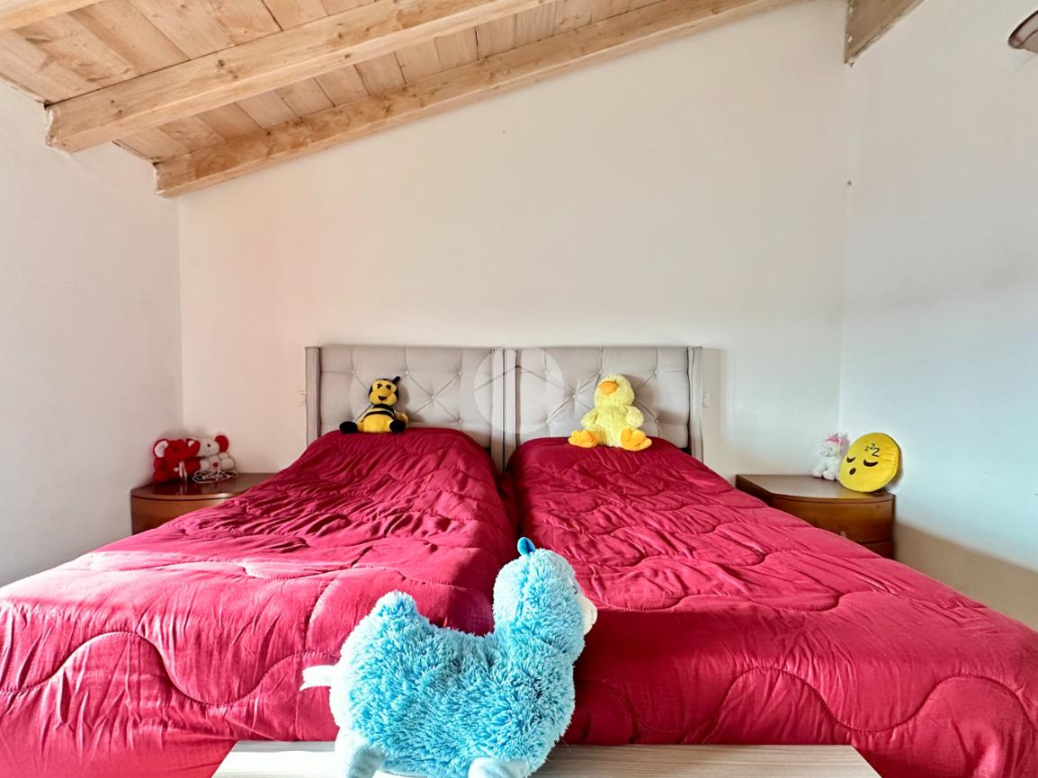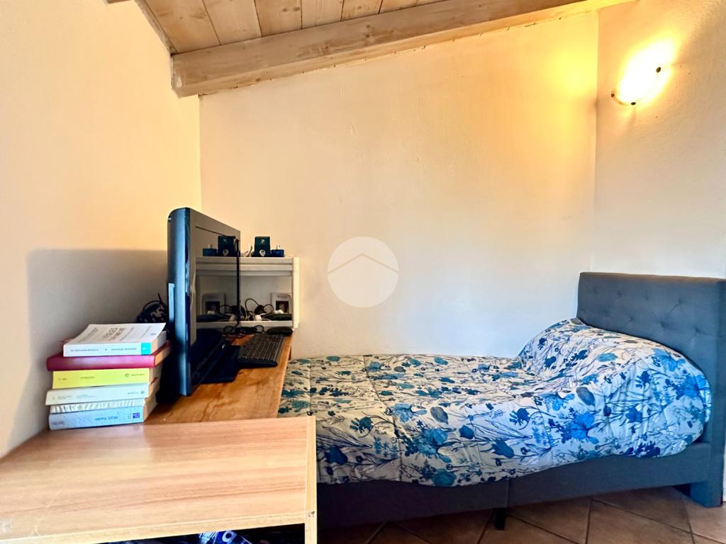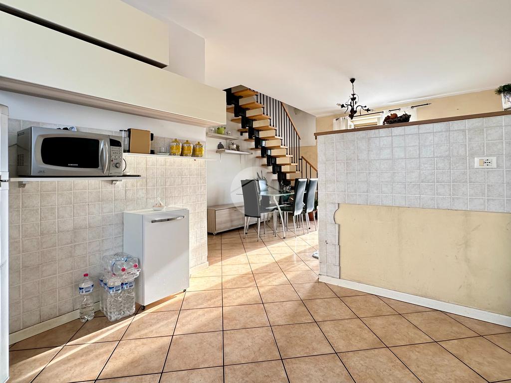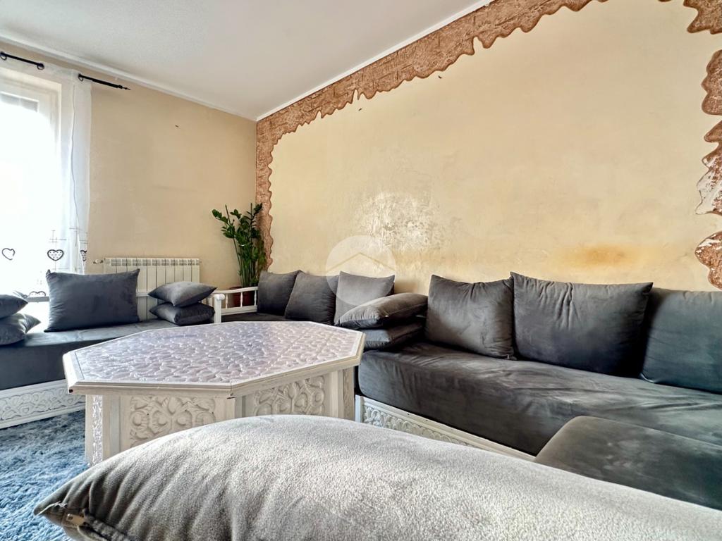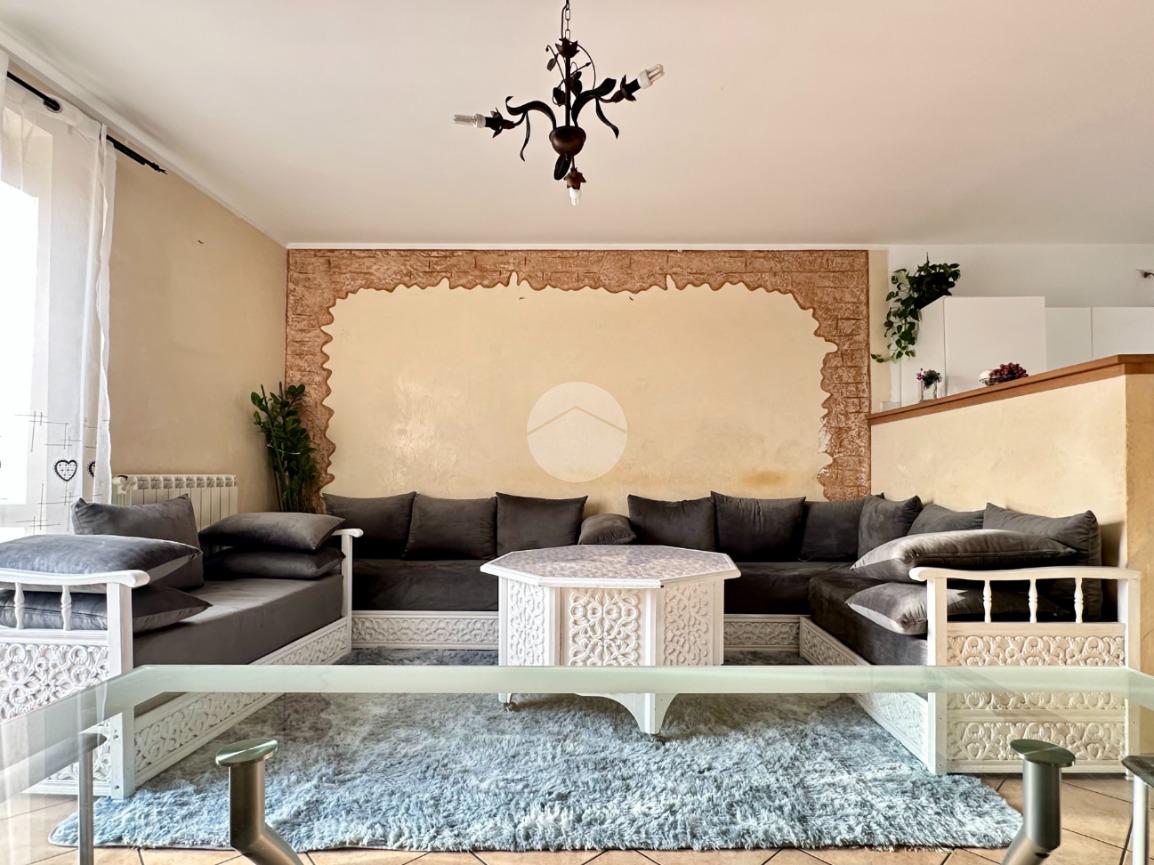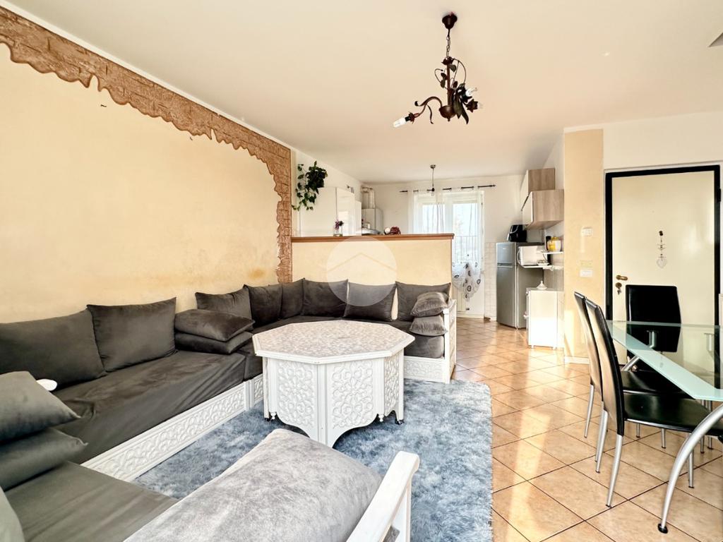 Dalla scala esterna, che accomuna due appartamenti al primo piano, si raggiunge l'abitazione. L'ingresso è diretto nell'ampio soggiorno, arredato da tavolo da pranzo e zona relax con ampio divano. Dal soggiorno si accede al comodo balcone.