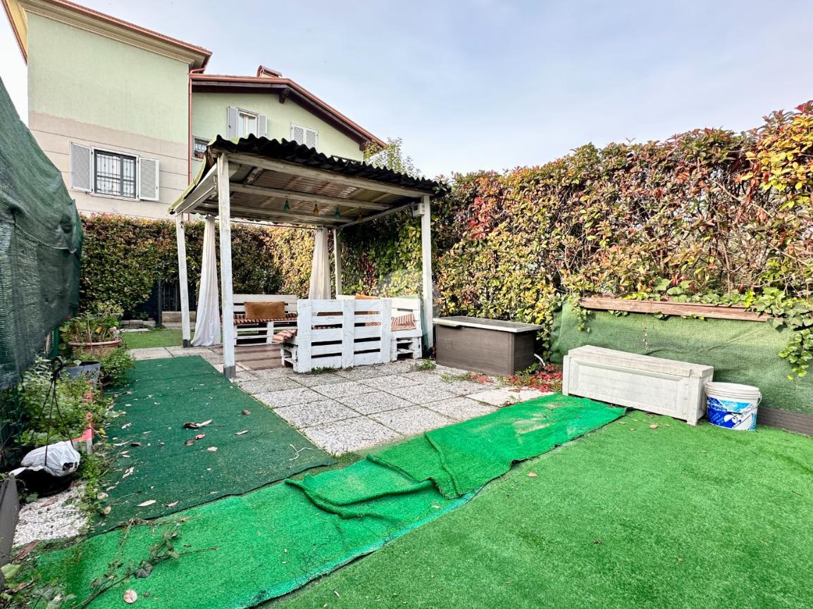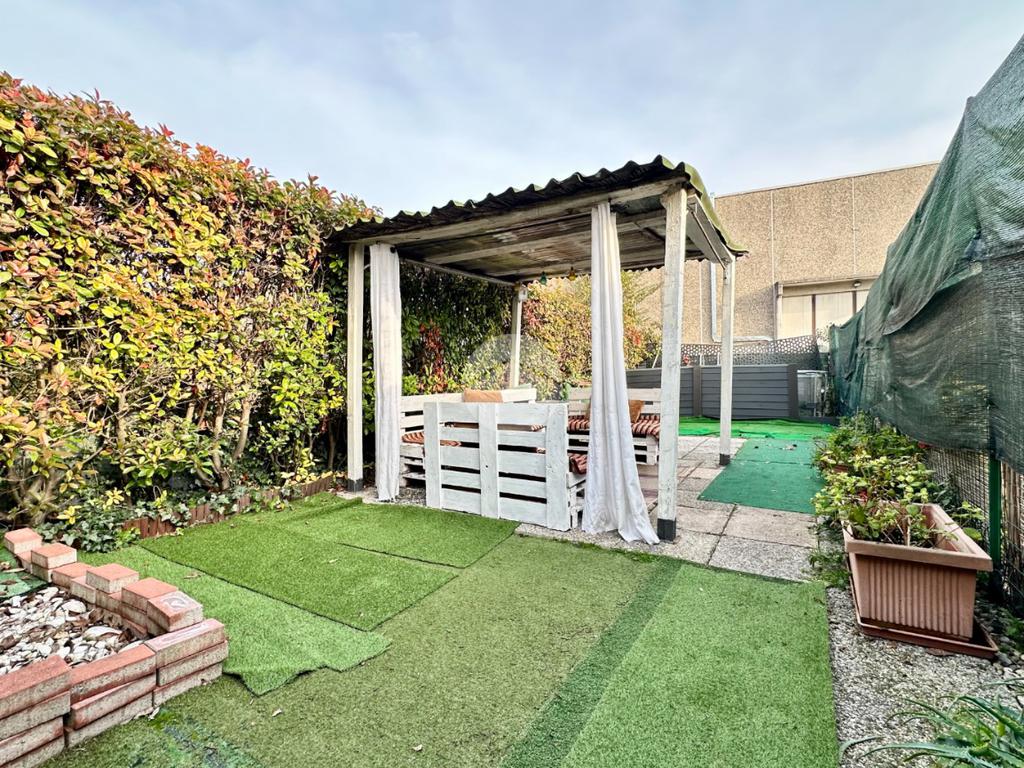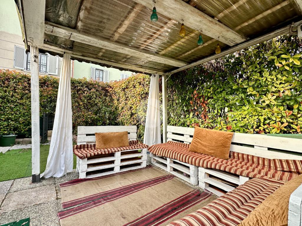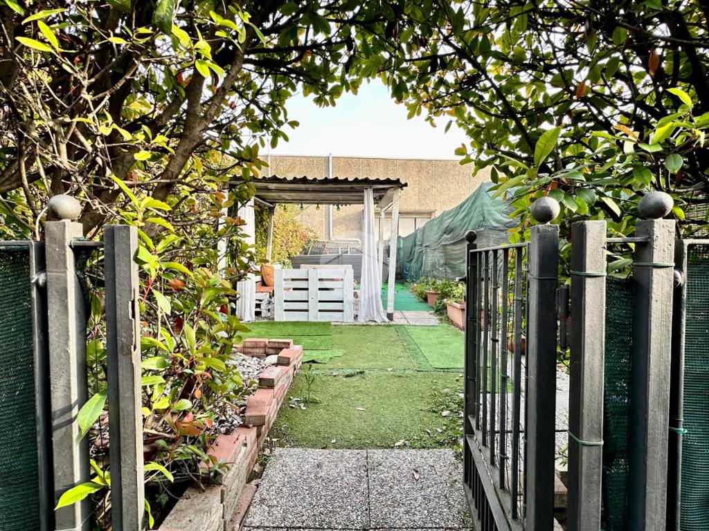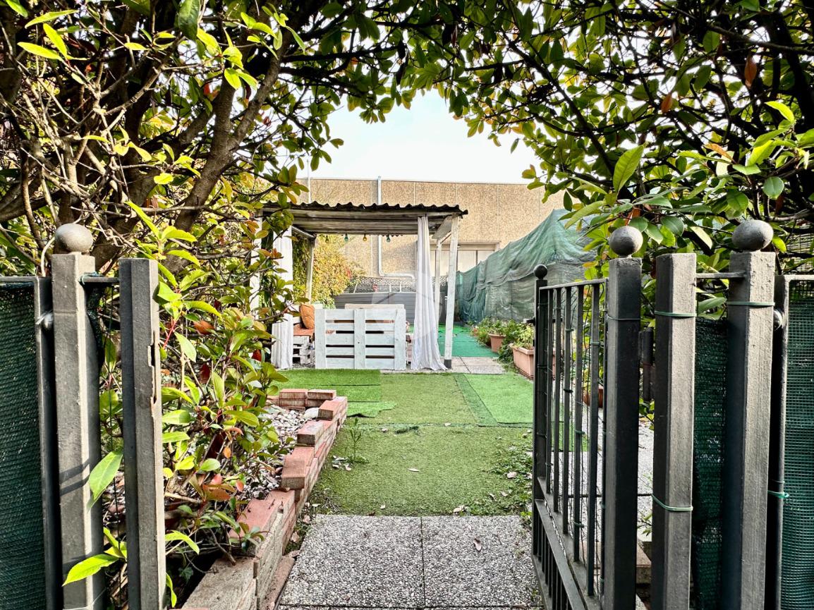 La soluzione è arricchita da un generoso giardino di proprietà, delimitato da un piccolo cancello di ingresso e, ai lati, da due siepi. Il giardino si trova oltre la corte condominiale, in posizione defilata e riparata rispetto l'ingresso carraio e pedonale.