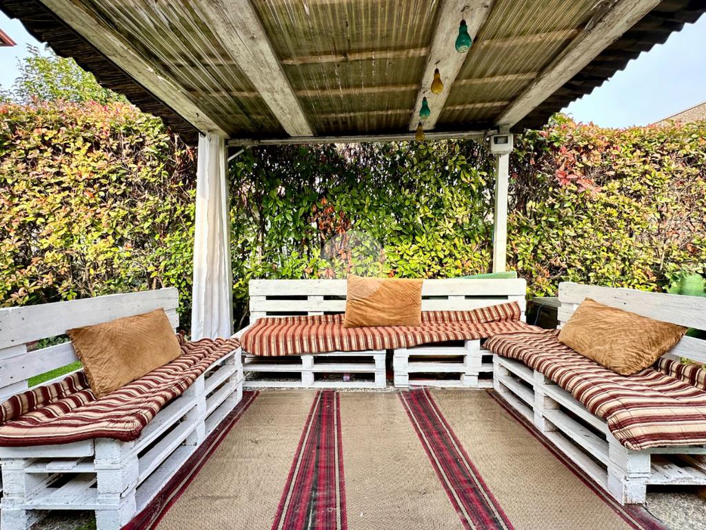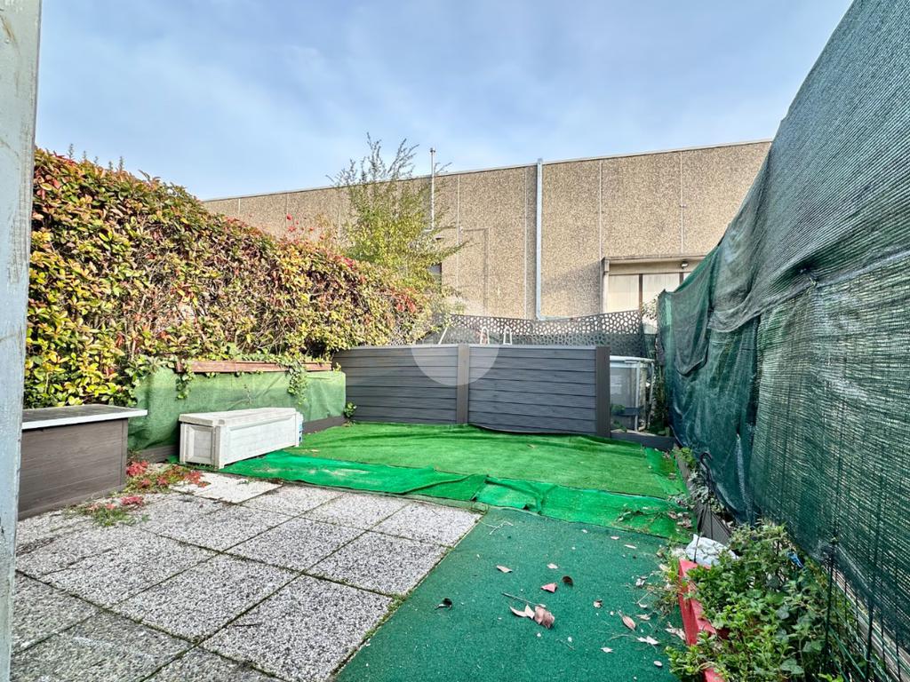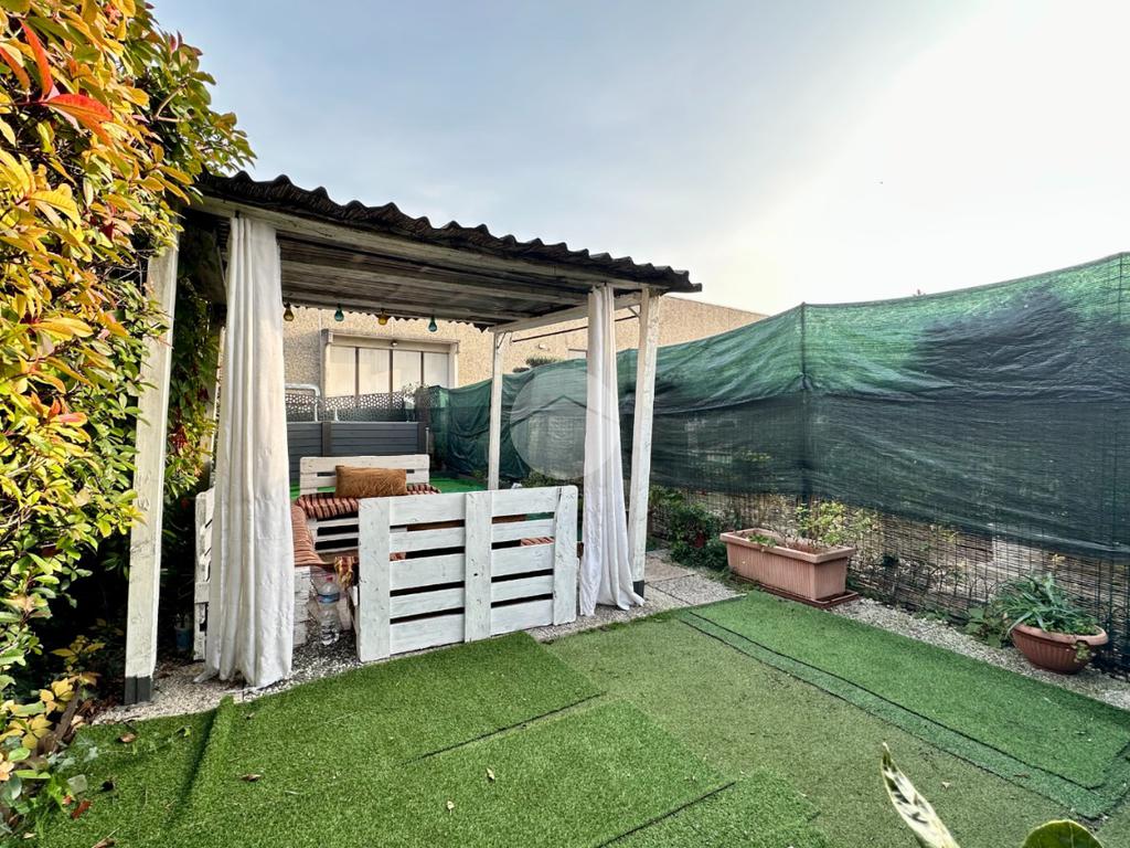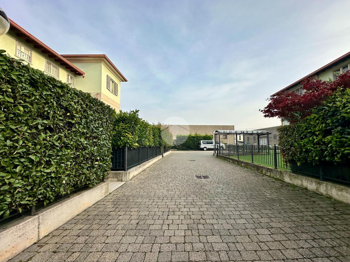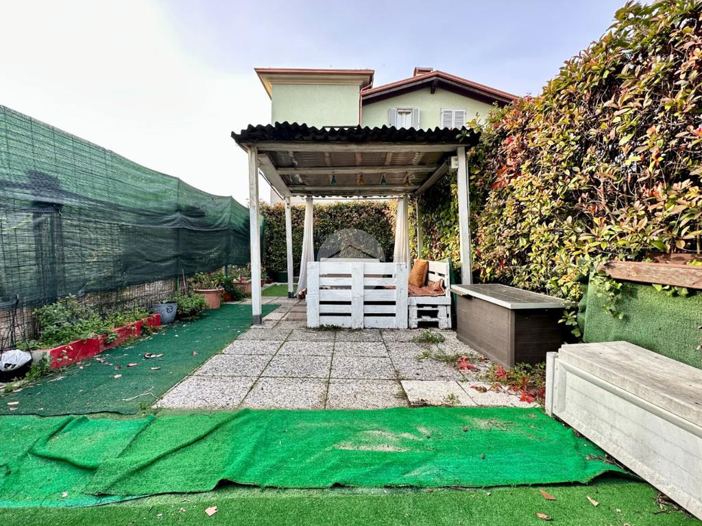 La soluzione è arricchita da un generoso giardino di proprietà, delimitato da un piccolo cancello di ingresso e, ai lati, da due siepi. Il giardino si trova oltre la corte condominiale, in posizione defilata e riparata rispetto l'ingresso carraio e pedonale.