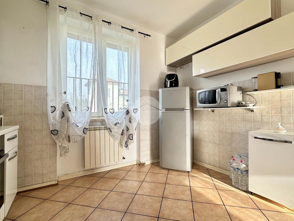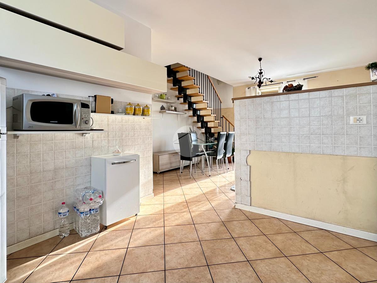 La cucina è semi separata da una piccola parete, ed illuminata da una propria finestra con affaccio sulla corte interna.